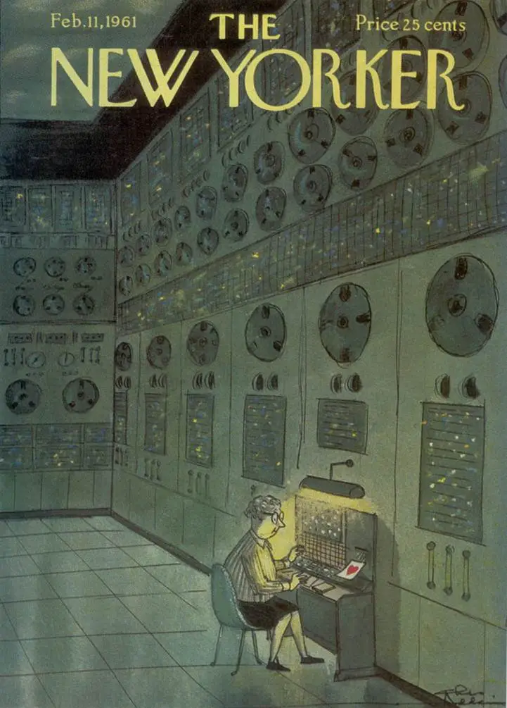 Let's rewind a bit. In 1961, the New Yorker ran a cover featuring a massive computer spewing out a tiny paper card with a red heart on it for its operator. The depiction was meant to represent the potential challenge to the capabilities of human beings posed by these new machines. Fast forward to the late 1960s and mid-1970s, and you have the rise of computer dating services in the United States, using questionnaire data to match singles.